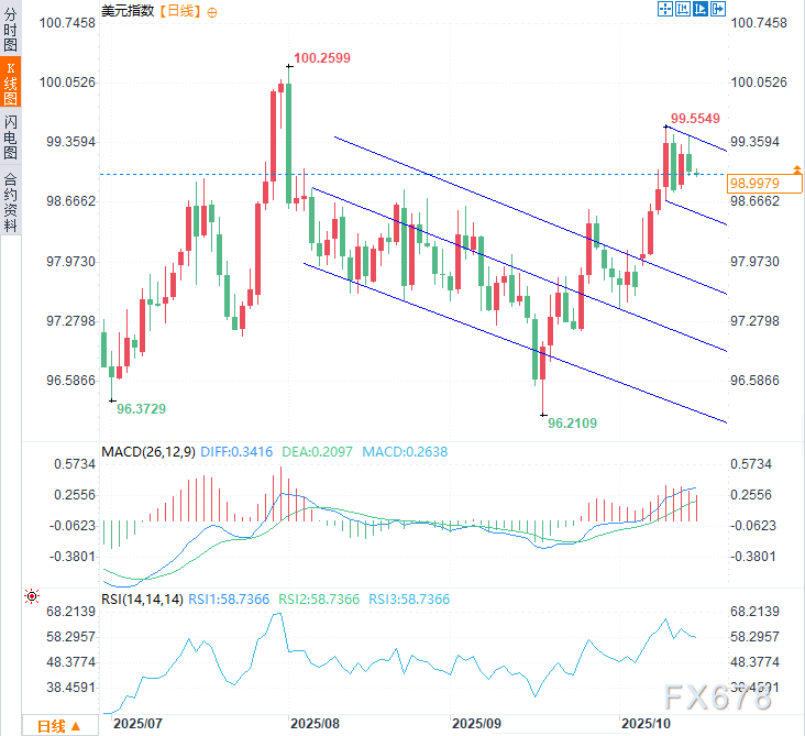 汇通财经APP讯——周二(10月14日)晚间美联储主席杰罗姆·鲍威尔释放信号称,10月降息仍在考虑之中,量化紧缩政策也可能接近尾声,美元随后震荡走软。周三亚市早盘时段,美元基本守住前一交易日跌幅,于99.00附近震荡。