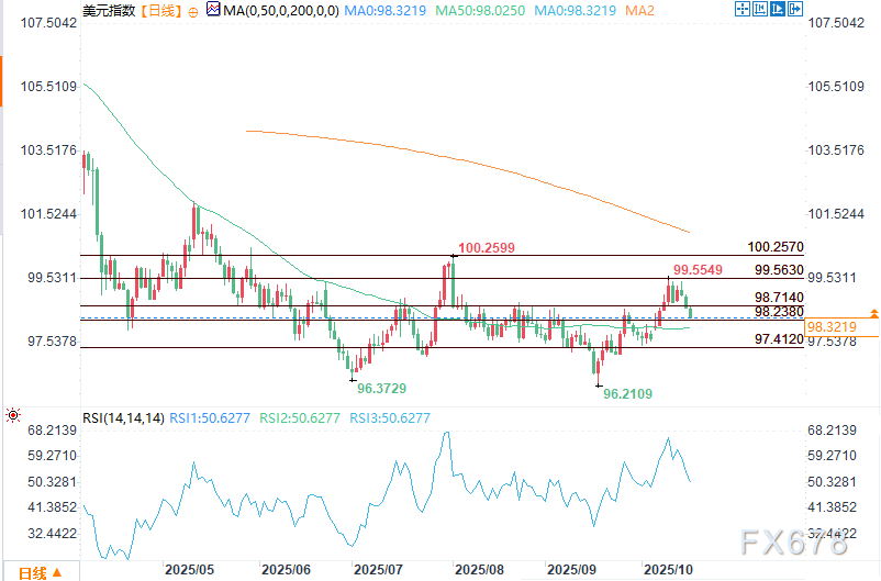 汇通财经APP讯——周四(10月16日)美盘时段,美元指数小幅下跌,跌破98.714这一关键水平,该水平目前已转化为阻力位。下一个重要支撑位为98.238,再往下则是50日均线所在的98.033——若跌破这一关键水平,可能引发更大幅度的市场波动。