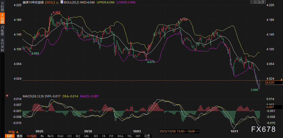 转向技术面,240分钟图上,10年期收益率的回落路径清晰:日内从前高4.076%急转直下,刺穿布林带中轨4.046%,逼近下轨3.996%,最低触及3.999%。MACD指标显示DIFF线-0.017,DEA线-0.014,柱状图-0.007,动能线虽趋平,但零轴下方死叉格局未破,暗示下行动能暂缓。布林带整体收窄,上轨4.096%与下轨3.996%间距仅100个基点,通道压缩预示潜在突破,若守住下轨反弹,则回测中轨概率不低;反之,失守3.996%将打开更深调整空间。