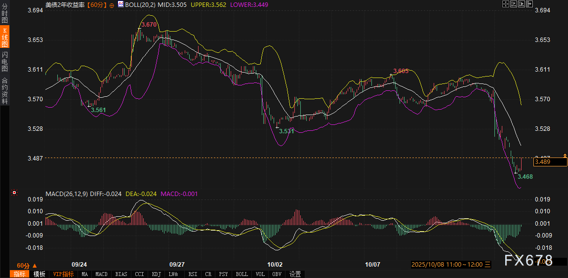汇通财经APP讯——周二(10月14日),美债市场延续隔夜风险偏好回落态势,收益率整体下探,10年期美债收益率报4.02%,日内回落0.79%,触及近期低点3.999%;2年期收益率则更显疲软,报3.489%,日内跌幅达1.08%,刷新一个月低位3.468%。这一轮调整将10年期与2年期收益率差拉阔至约53个基点,曲线陡峭化迹象初现,叠加隔夜美股期货集体走低——标普500期货跌超1%,纳斯达克期货重挫1.4%——市场情绪趋于谨慎。