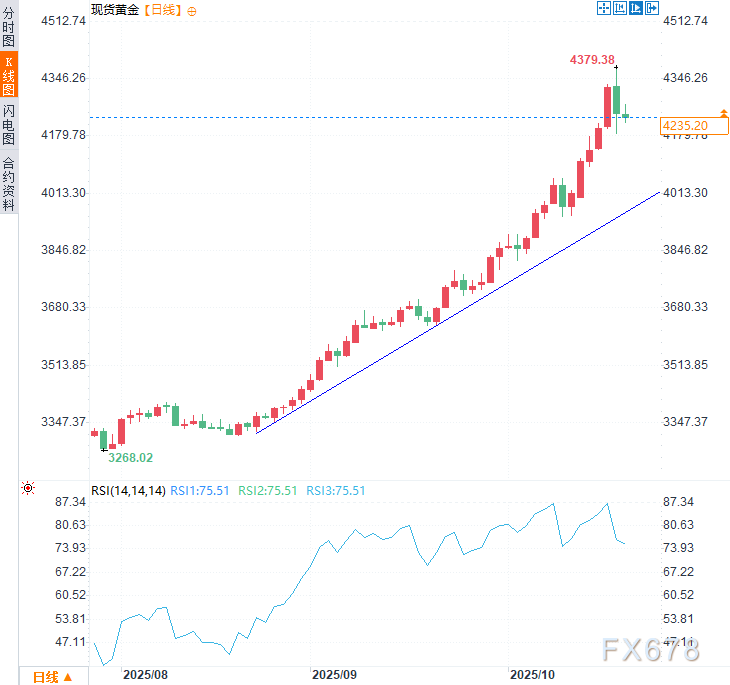 上周五现货黄金一度触及4379.38美元/盎司的历史新高,却以1.8%的跌幅收盘于4247.17美元/盎司。周一亚市时段,现货黄金一度冲高至4274.53美元/盎司的高位,因中东地区地缘政治风险助推避险买盘,但随后迅速回吐涨幅,徘徊在4250美元附近。