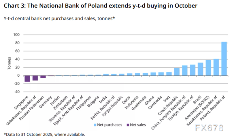 戈保尔指出:“波兰国家银行在暂停购买5个月后,于10月重新进入市场。在近期将其黄金配置目标提高至30%后,该行当月购买16吨黄金,使其黄金储备增至531吨,按照10月底金价计算,占总储备的比例达到26%。”