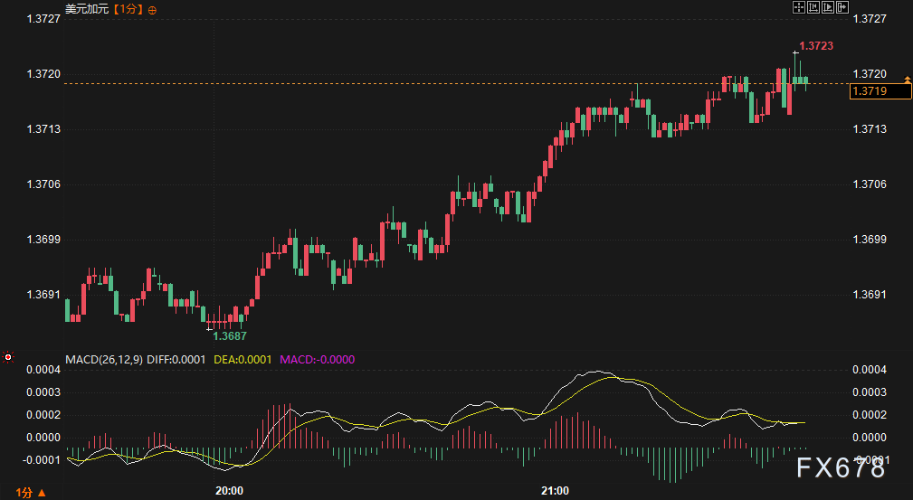 这种“增长疲软+通胀上行风险”的组合,限制了央行立即降息的空间。技术面上,美元兑加元在1.3720附近表现出明显的整理迹象。观察技术指标发现,MACD(平滑异同移动平均线)在零轴上方呈现横向走势,红色动能柱缩减,暗示多头力量有所衰竭。