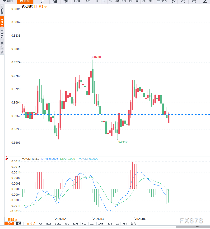 从技术面来看,日线级别上,EUR/GBP持续震荡下行,整体趋势偏空,价格不断刷新阶段低点,显示英镑相对强势。关键支撑位位于0.8620附近,若跌破可能进一步下探至0.8550区域;上方阻力位集中在0.8700至0.8750区间。动能指标显示空头趋势仍在延续。4小时级别来看,汇价处于下行通道内运行,短期均线持续压制反弹,若无法突破0.8700上方,则弱势结构仍将维持。